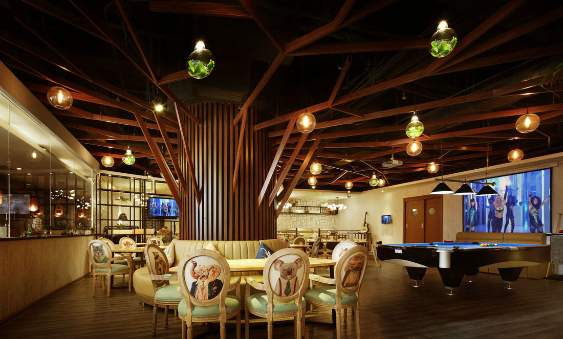 原來的棋牌室地面抬高,入口處加了地燈,墻面獨特挑選的墻紙和色彩的乳膠漆裝飾,原來的沉悶感一掃而空。在酒吧一角增加了駐唱的位置和投影儀,在這里有歌手的專業演繹,客人沉醉在音樂中,讓人流連忘返。另外為了空間更加豐富,我們在大廳抬高了兩塊位置,用鐵藝欄桿和隔斷區分空間,特別定制的木格則讓空間增色不少。