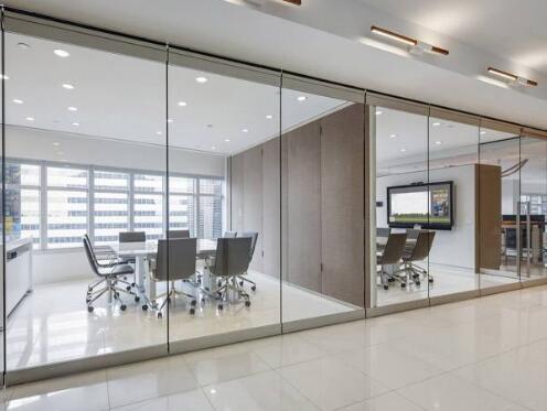 普通玻璃隔斷是我們在最常見到的一種辦公室裝修隔斷方式,而玻璃隔斷的優點也很明顯,可以讓辦公室顯得更加寬敞、明亮,而且也有著環保、裝修速度快的優點,但在隔音效果上相對較差一些。