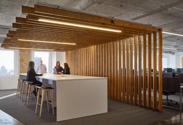 不同時段的開燈效果:企業的燈光在初設定時一定不是只有特定時間才會使用,要求在較暗的環境或夜晚時開燈后照明效果好,白天燈光柔和。在不同辦公室裝修空間中燈光照明需結合空間功能及使用者習慣展示不同的照明方式,需要結合環境進行組合,創造更便于工作氛圍。